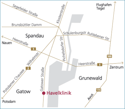 Die Klinik-Praxis liegt am Rande Berlins in entspannter, schon fast ländlicher Umgebung, ist mit öffentlichen Verkehrsmitteln und dem Auto aber sowohl von Berlin (über Heerstraße/Expressbus vom Fern-/S-und U-Bahnhof Zoologischer Garten) wie auch von Potsdam aus schnell zu erreichen.