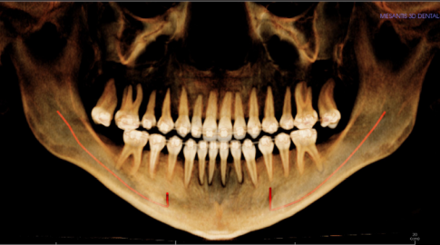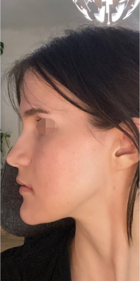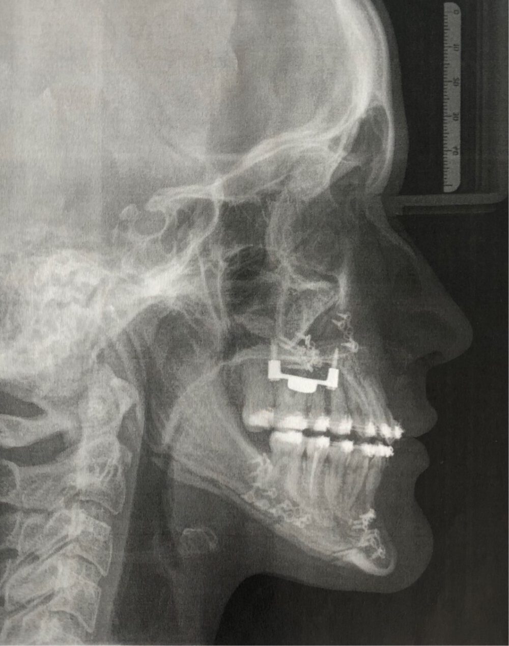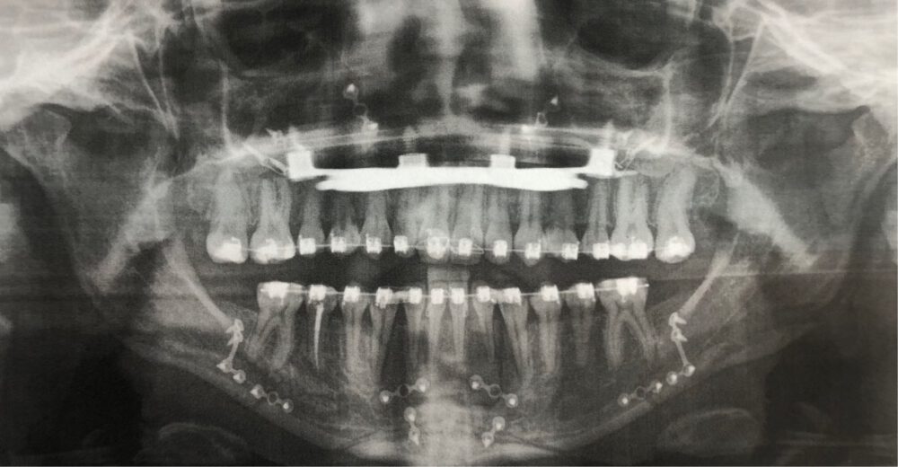 Surgery First: Bignathe Umstellungsosteotomie (Minimalinvasive Le Fort I Osteotomie mit Vorverlagerung und simultaner Oberkieferdistraktion, gesonderte Spina Nasalis Osteotomie zur besseren Kontrolle von Oberlippenposition und -volumen, Anhebung der Nasenspitze, Unterkiefersegmentosteotomie 32-42 zur Vergrößerung der sagittalen Stufe (Dekompensation),
